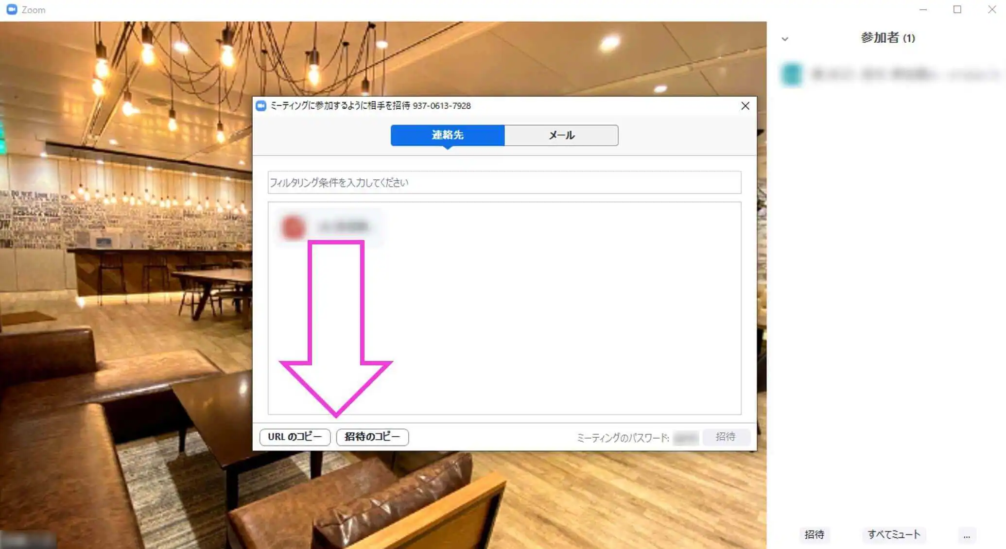 また「招待のコピー」を選択すると、表記されている「ミーティングのパスワード」がURLとともにコピーされ、パスワード無しではミーティングが開始できないようになります。