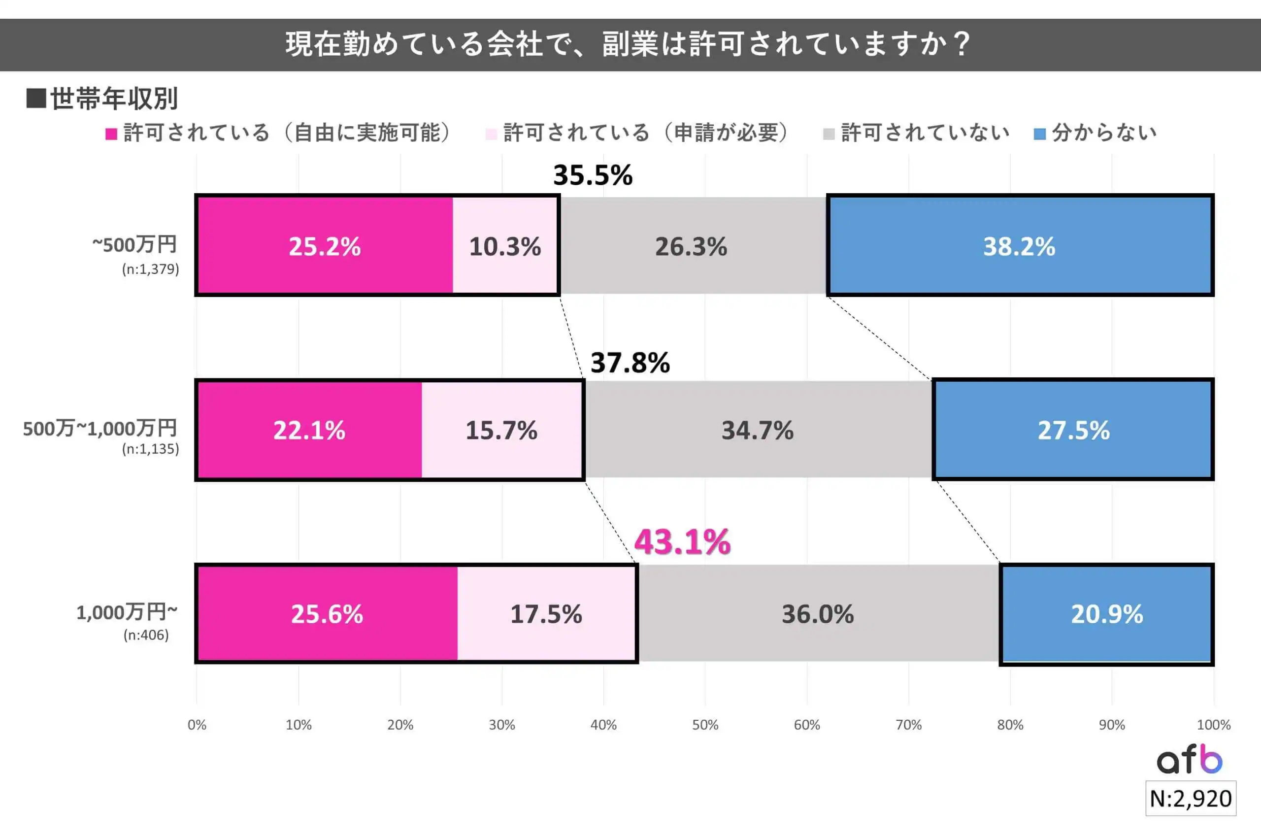世帯年収別に見ると、世帯年収が上がるにつれ、副業が許可されている企業で働いている方が増える結果となりました。また、「分からない」と回答された方は世帯年収が上がるにつれ減少しており、自身が勤める企業の就業規則を把握されていることが分かります。