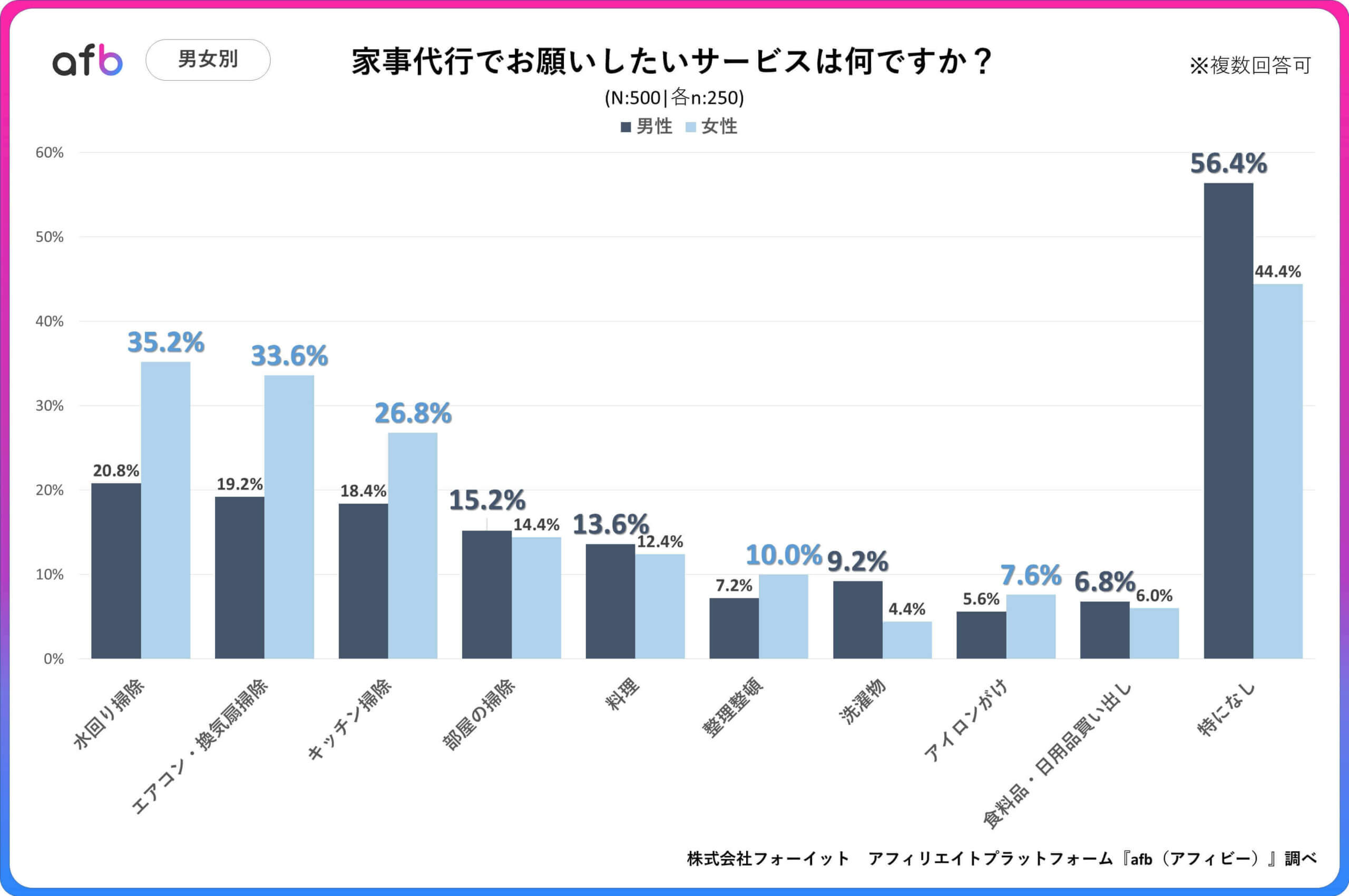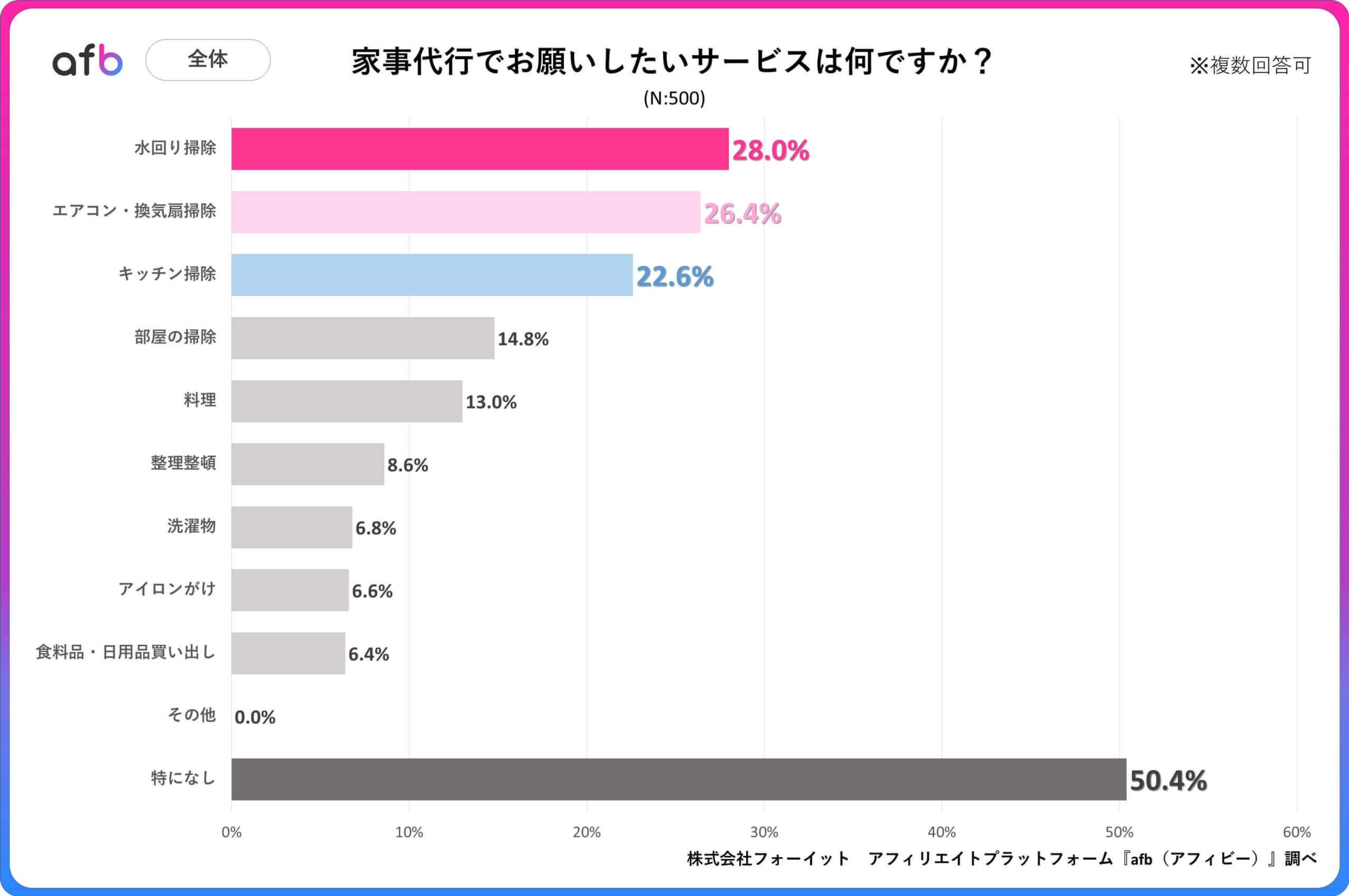 全国の20代〜60代の男女を対象に、「家事代行でお願いしたいサービスは何ですか?」というアンケートを実施したところ、最も多かった回答は「水回り掃除」で28.0%でした。次いで、「エアコン・換気扇掃除」が26.4%、「キッチン掃除」が22.6で続くという結果になりました。また、「特になし」と回答した方は50.4%となっており、半数近くの方が家事代行を利用したいと考えていることが分かりました。