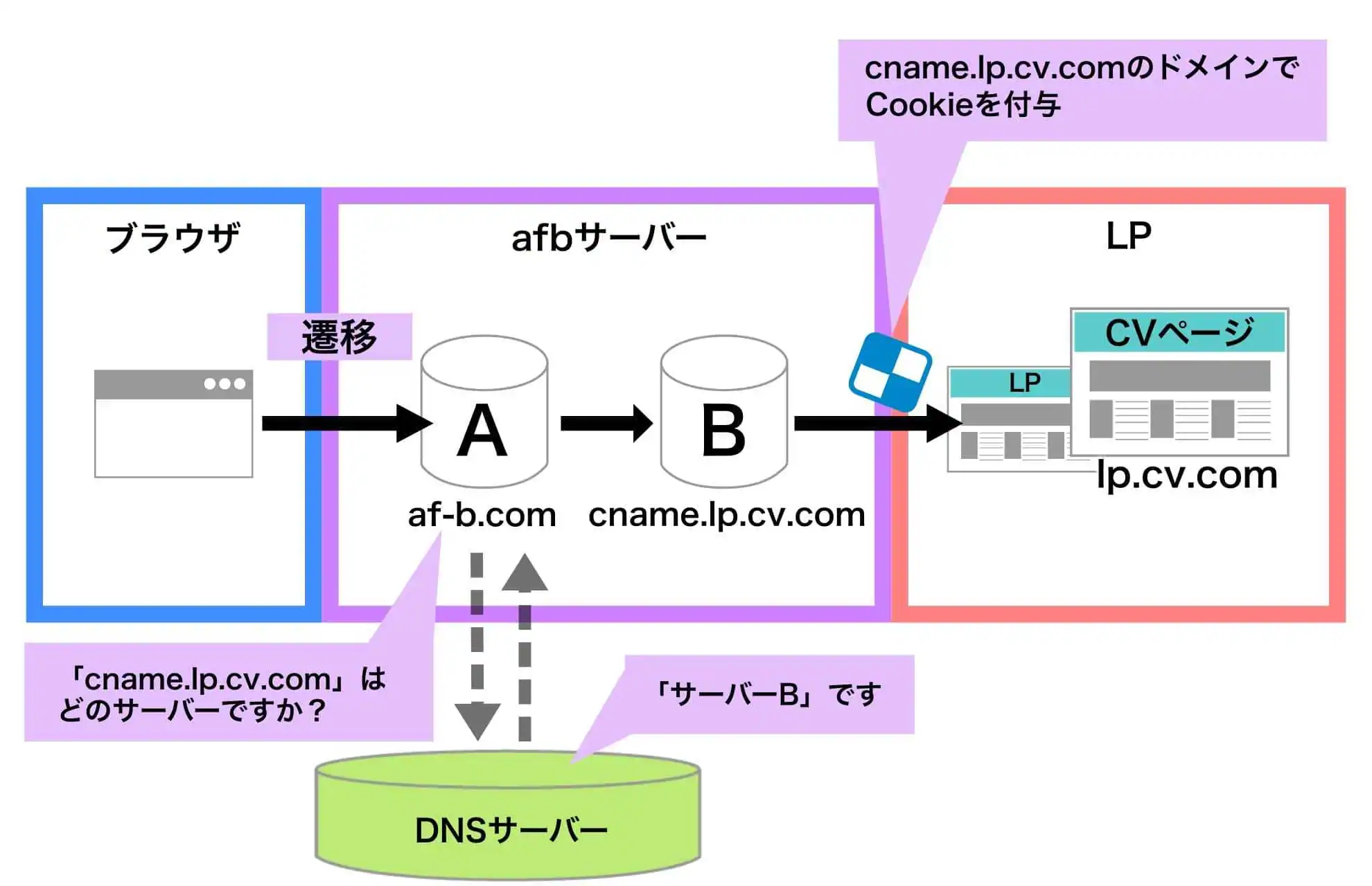 しかし、CNAMEを利用することで、CVページのドメインとafbのドメインを同じにし、ITPによるCookie削除を回避します。簡単に仕組みを言うのなら、サーバーに同じ「あだ名」を付けることで、擬似的にサーバー名を統一しているのです。