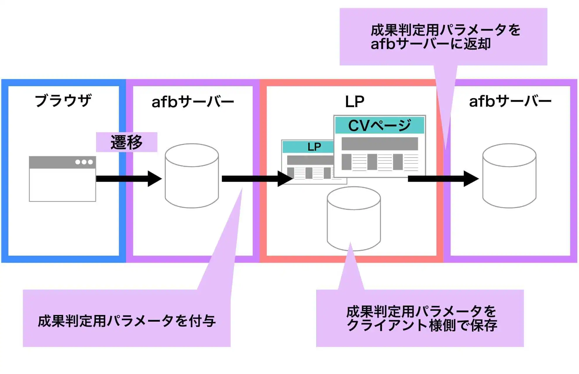 ユーザーがCVページに辿り着いたのなら、その追跡情報をafbのサーバーに返却することで成果を計測しているのです。