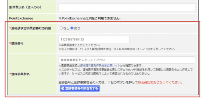 上記で「あり」を選択したパートナー様は、その下の入力欄で登録番号・登録事業者名の入力を行ってください。
